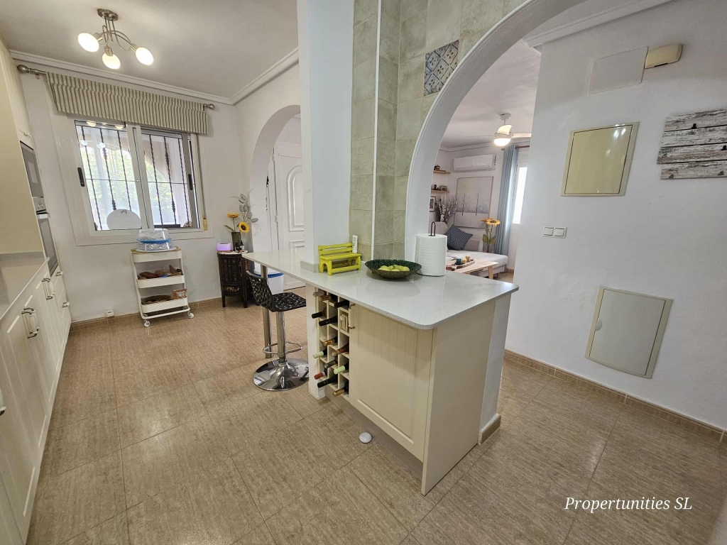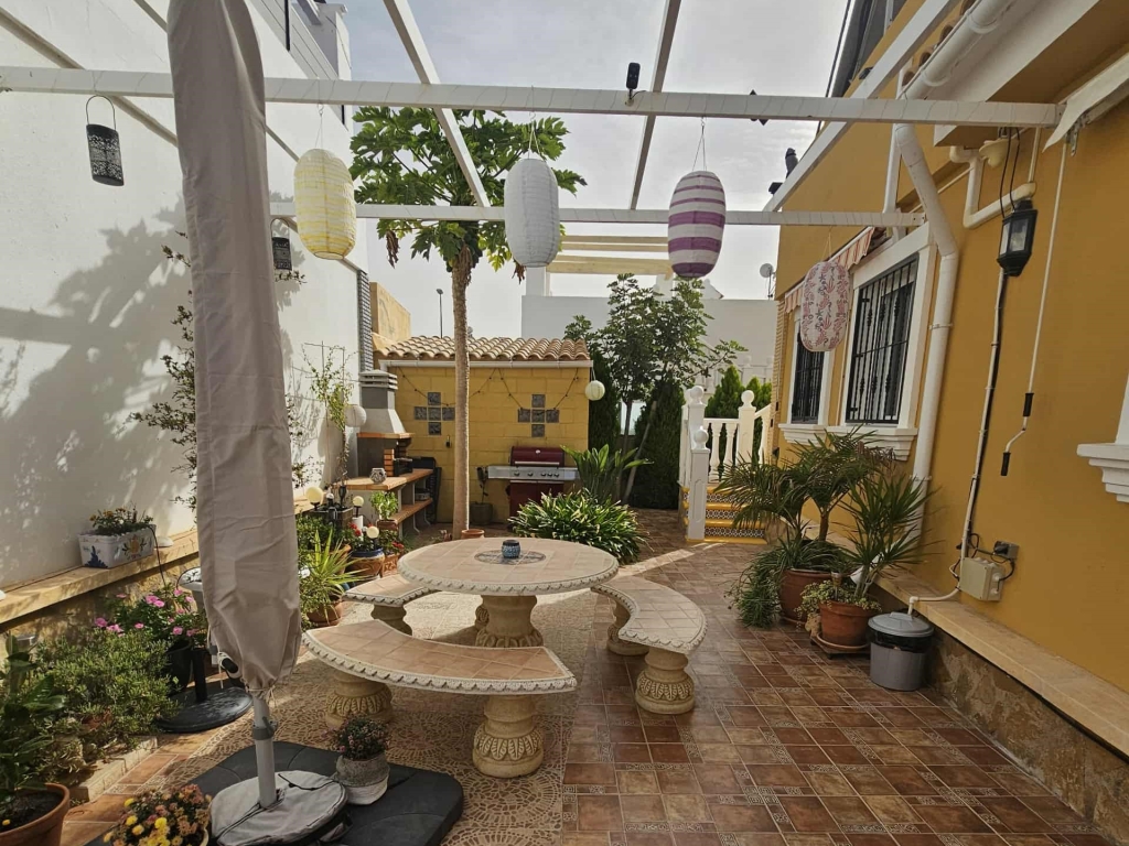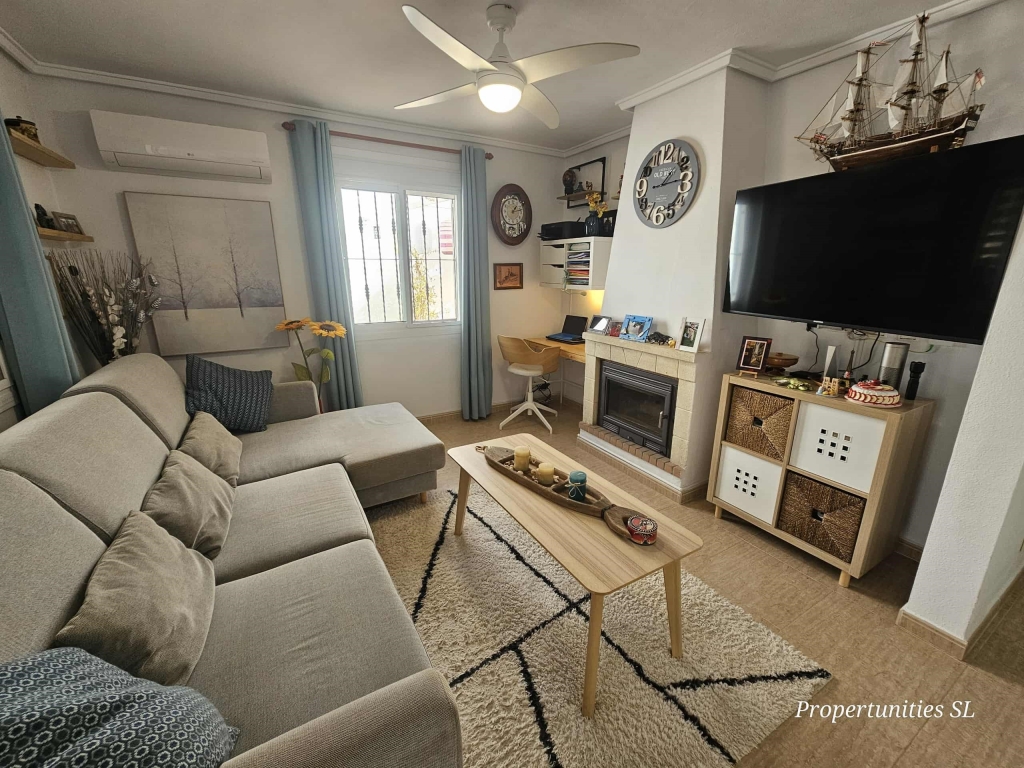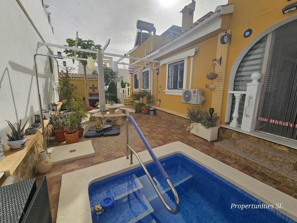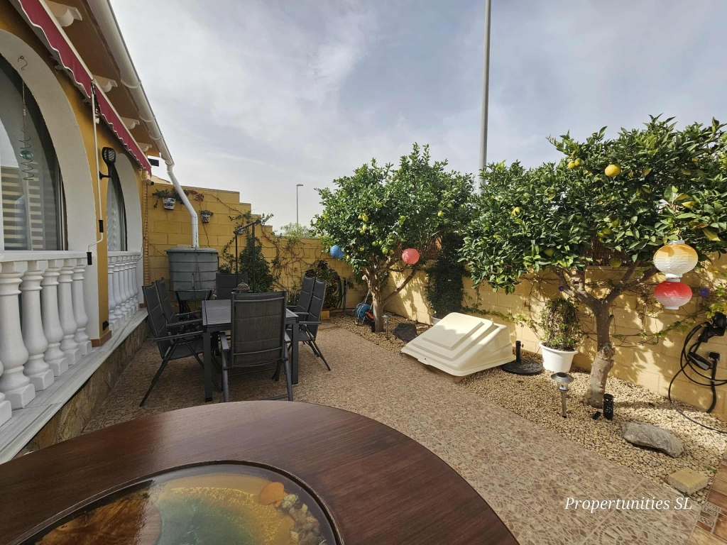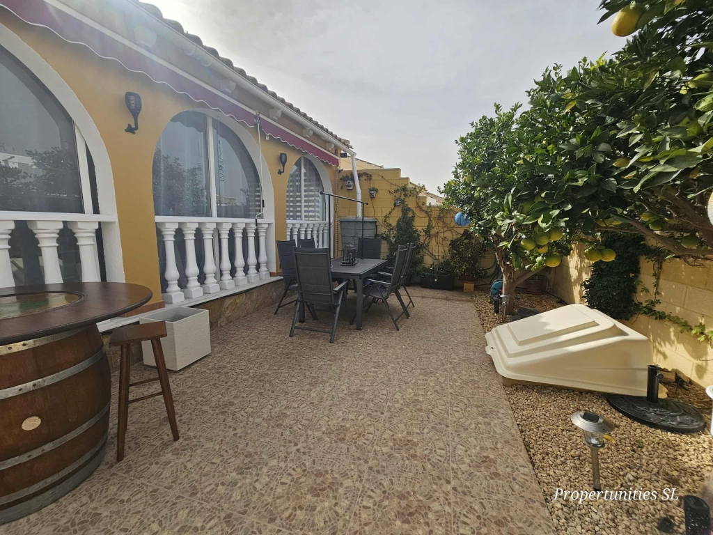 160 Modern Detached Villa with Solar Power, Private Pool & Bar Sierra Golf, Jerónimo y Avileses, Murcia – 30592 Discover contemporary, energy-efficient living in this beautifully presented 2-bedroom, 2-bathroom detached villa located in the sought-after Urbanización Sierra Golf. Fully furnished and move-in ready, this property offers exceptional comfort, sustainability, and style. This well-maintained villa features a 10 kWh solar system with 12 panels and battery storage, capable of powering an electric vehicle, significantly reducing energy costs. A newly installed solar hot water system with a backup electric boiler ensures efficient and reliable hot water throughout the year. Inside, the home boasts a modern open-plan kitchen with brand-new appliances, fully air-conditioned rooms with WiFi-enabled heat pumps, and a charming covered entrance porch enclosed with glass—ideal for year-round dining and relaxation. Both bathrooms have been fully renovated with modern walk-in showers, heating, and electric fans. The expansive solarium provides multiple seating areas and a fully enclosed wood-framed bar, perfect for hosting family and friends. The bedrooms, living room, and porch are equipped with DC drive ceiling fans, and the living room features a cozy log-burning fireplace for added warmth and ambiance. Outside, the private garden offers high privacy walls, fruit trees, low-maintenance landscaping, and a private swimming pool. Several side awnings and stand-up umbrellas provide flexible shading options. Outdoor cooking enthusiasts will enjoy both the gas BBQ and traditional Spanish-style brick BBQ. Two brick-built storage sheds with power supply—one fitted with a fridge and independent freezer—provide excellent additional storage. Security and connectivity are top-tier with multiple solar-powered WiFi security cameras, Starlink satellite internet, and windows fitted with shutters, grills, and fly screens.