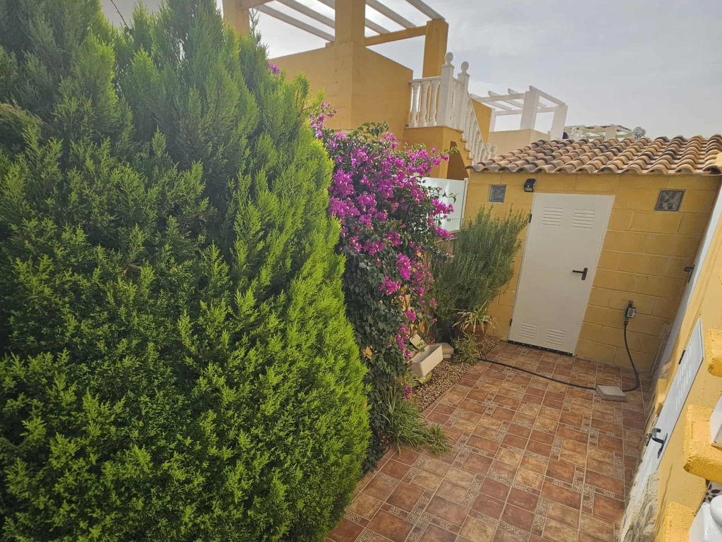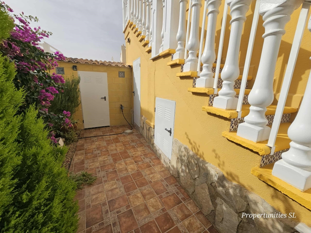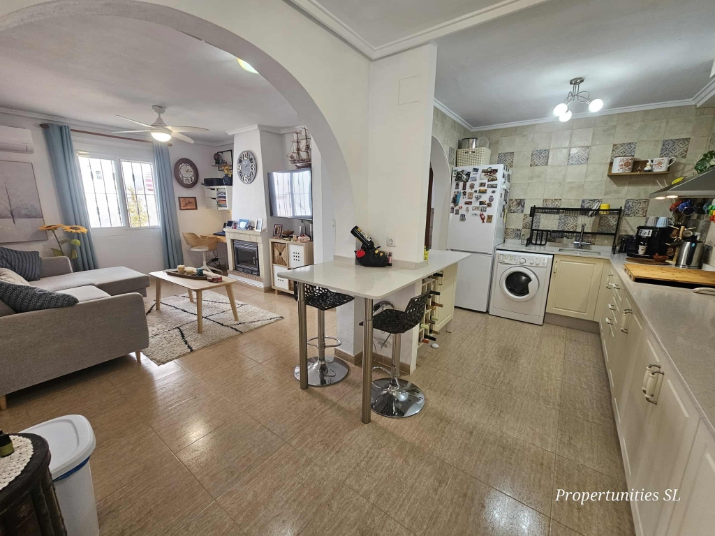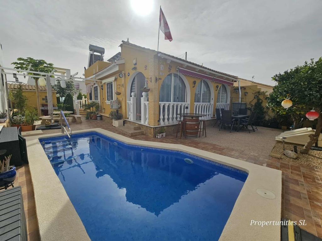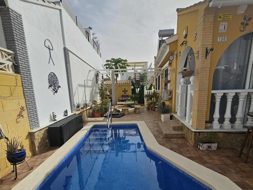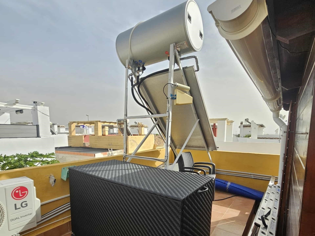 160 Modern Detached Villa with Solar Power, Private Pool & Bar Sierra Golf, Jerónimo y Avileses, Murcia – 30592 Discover contemporary, energy-efficient living in this beautifully presented 2-bedroom, 2-bathroom detached villa located in the sought-after Urbanización Sierra Golf. Fully furnished and move-in ready, this property offers exceptional comfort, sustainability, and style. This well-maintained villa features a 10 kWh solar system with 12 panels and battery storage, capable of powering an electric vehicle, significantly reducing energy costs. A newly installed solar hot water system with a backup electric boiler ensures efficient and reliable hot water throughout the year. Inside, the home boasts a modern open-plan kitchen with brand-new appliances, fully air-conditioned rooms with WiFi-enabled heat pumps, and a charming covered entrance porch enclosed with glass—ideal for year-round dining and relaxation. Both bathrooms have been fully renovated with modern walk-in showers, heating, and electric fans. The expansive solarium provides multiple seating areas and a fully enclosed wood-framed bar, perfect for hosting family and friends. The bedrooms, living room, and porch are equipped with DC drive ceiling fans, and the living room features a cozy log-burning fireplace for added warmth and ambiance. Outside, the private garden offers high privacy walls, fruit trees, low-maintenance landscaping, and a private swimming pool. Several side awnings and stand-up umbrellas provide flexible shading options. Outdoor cooking enthusiasts will enjoy both the gas BBQ and traditional Spanish-style brick BBQ. Two brick-built storage sheds with power supply—one fitted with a fridge and independent freezer—provide excellent additional storage. Security and connectivity are top-tier with multiple solar-powered WiFi security cameras, Starlink satellite internet, and windows fitted with shutters, grills, and fly screens.